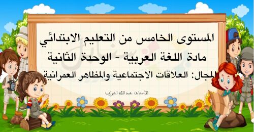 المستوى الخامس - مادة اللغة العربية - الوحدة الثانية - المجال: العلاقات الاجتماعية والمظاهر العمرانية - قواعد اللغة: المضاف والمضاف أليه، الجار والمجرور، النعت والمنعوت، المعطوف والمعطوف عليه، تصريف الفعل المهموز - الإملاء: رسم همزة القطع وسط الكلمة